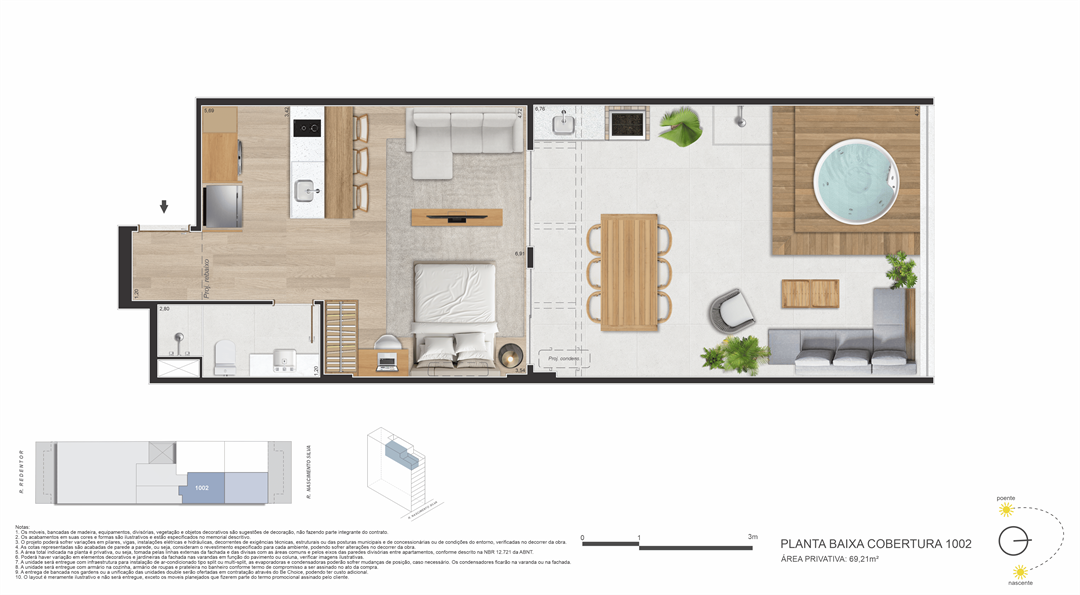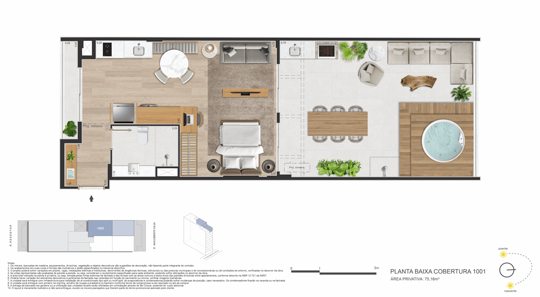Coberturas com terraço: 69,21 m² a 75,16 m², com hidromassagem, deck, bancada goumert com churrasqueira a carvão