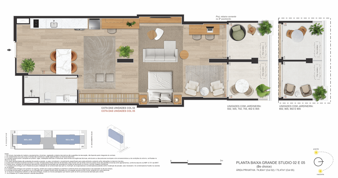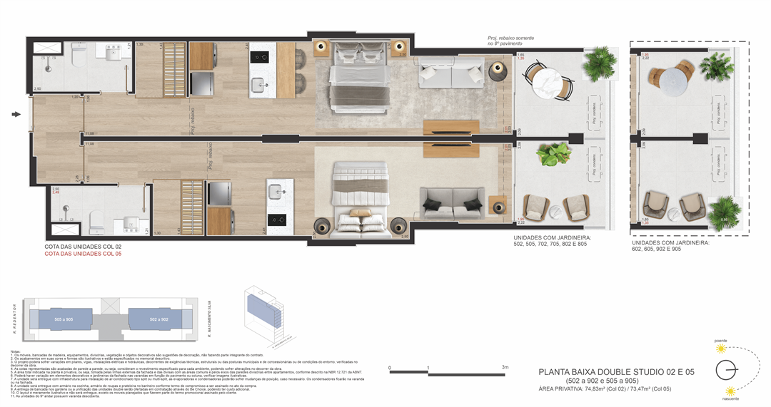 Double Suítes: 73,47 m² e 74,83 m²