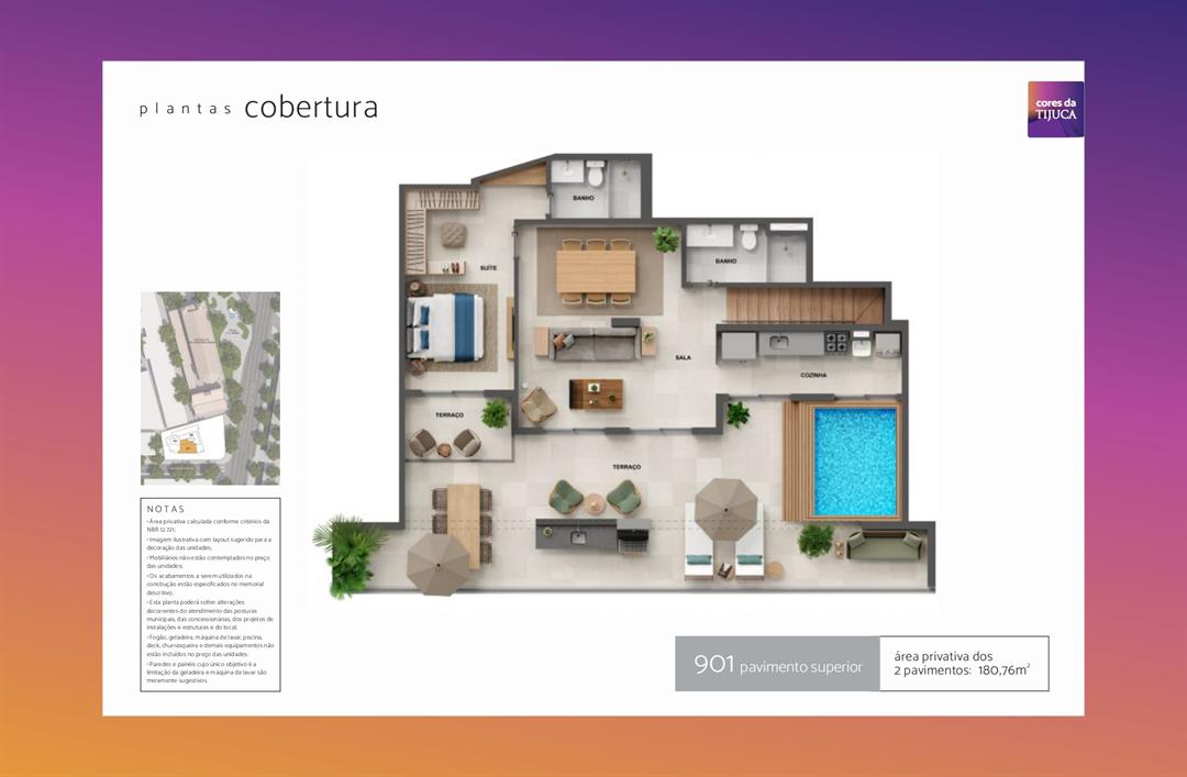 - Cobertura de 4 quartos: de 180,76 m², 4 quartos, a cobertura é o destaque do empreendimento, oferecendo amplitude, privacidade e uma vista privilegiada.