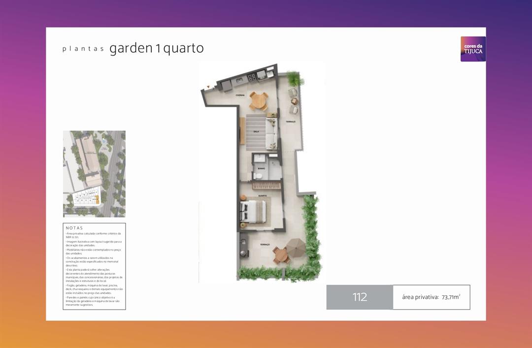 - Apartamentos Garden de 1 e 2 quartos: de 57,99 a 110,30 m² e de 64,56 a 109,46 m², oferecem uma experiência única, com áreas externas privativas que trazem um toque de verde e tranquilidade para o seu dia a dia.