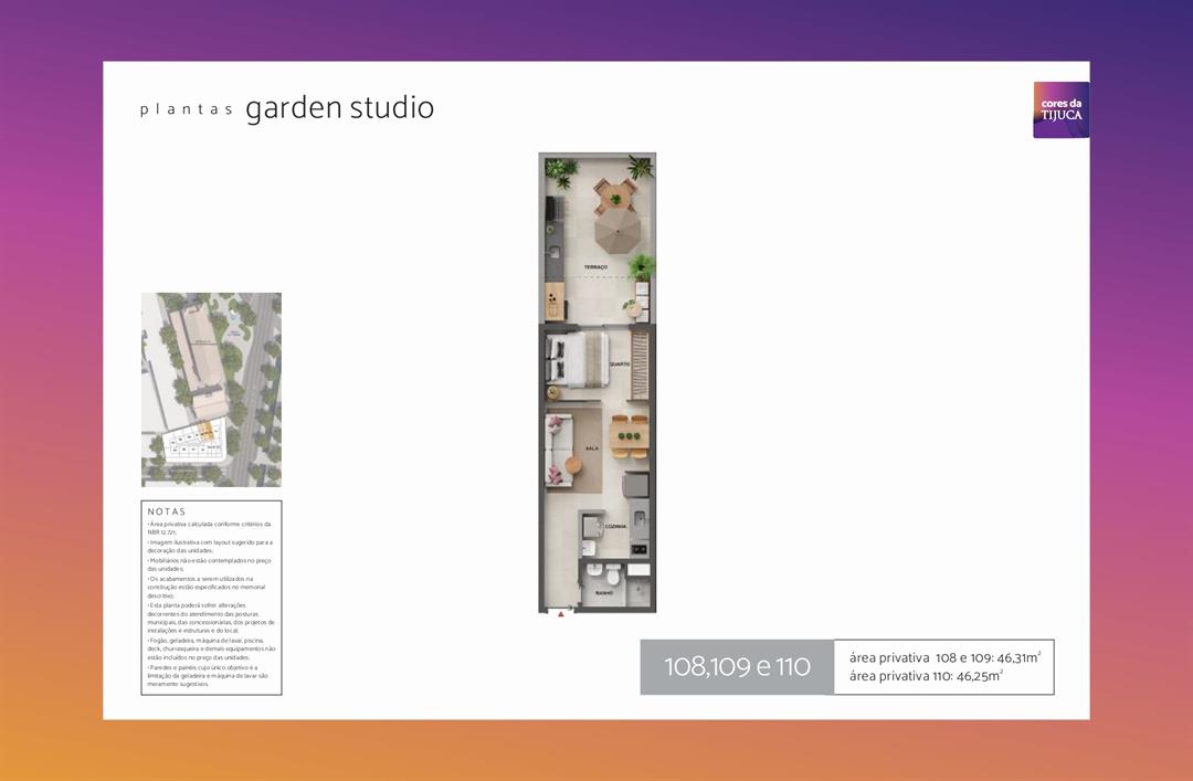 - Studios Gardens e Tipo: de 41,11 a 47,83 m² e de 34,46 à 44,08 m², perfeitos para solteiros, casais sem filhos ou como investimento para aluguel, os studios combinam funcionalidade e conforto em espaços bem planejados;