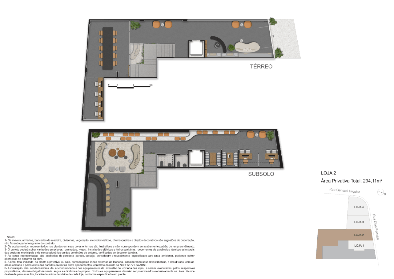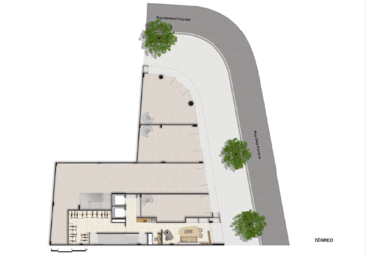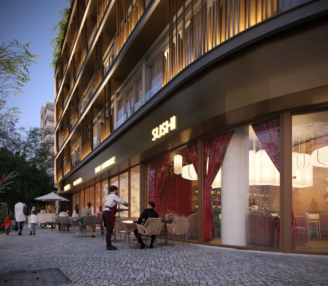 Além disso, o térreo abriga 4 lojas – No embasamento, com vitrine em viro, fator que reforça a valorização, o movimento da rua e a conveniência para moradores e visitantes.