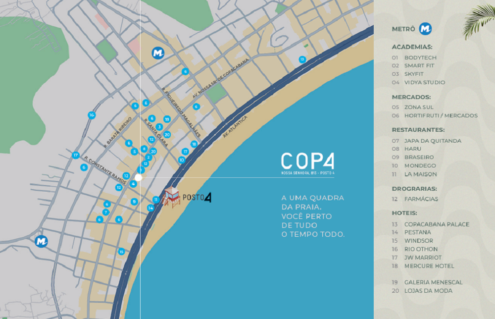 E nosso lançamento está posicionado estrategicamente no Posto 4, uma das áreas mais privilegiadas da própria Avenida Nossa Senhora de Copacabana.